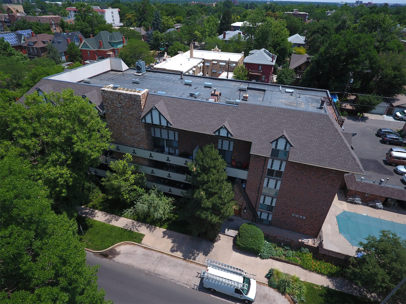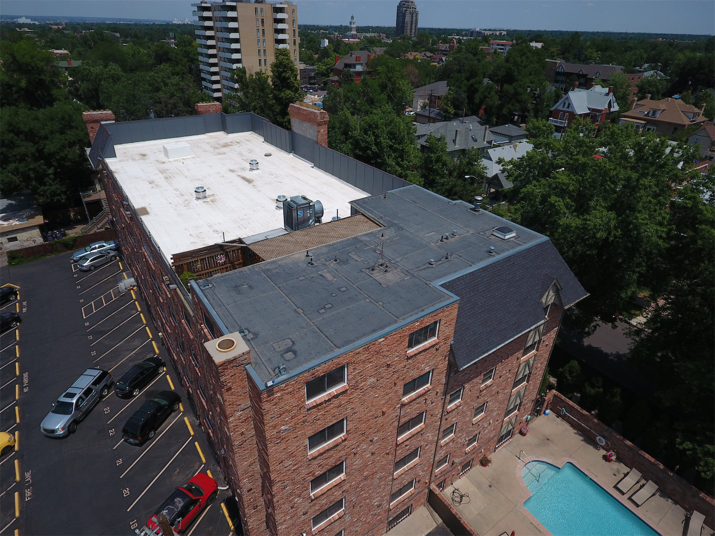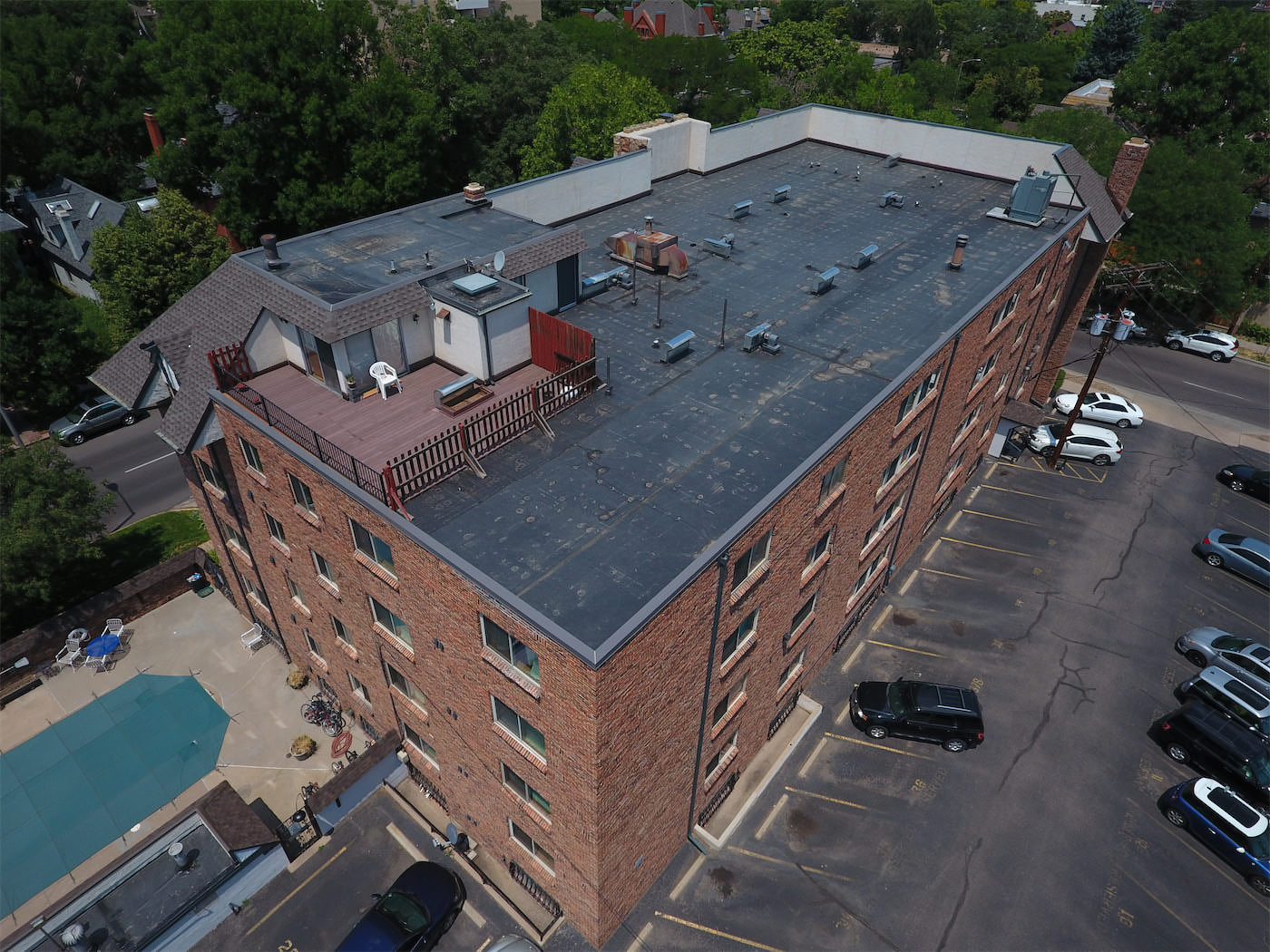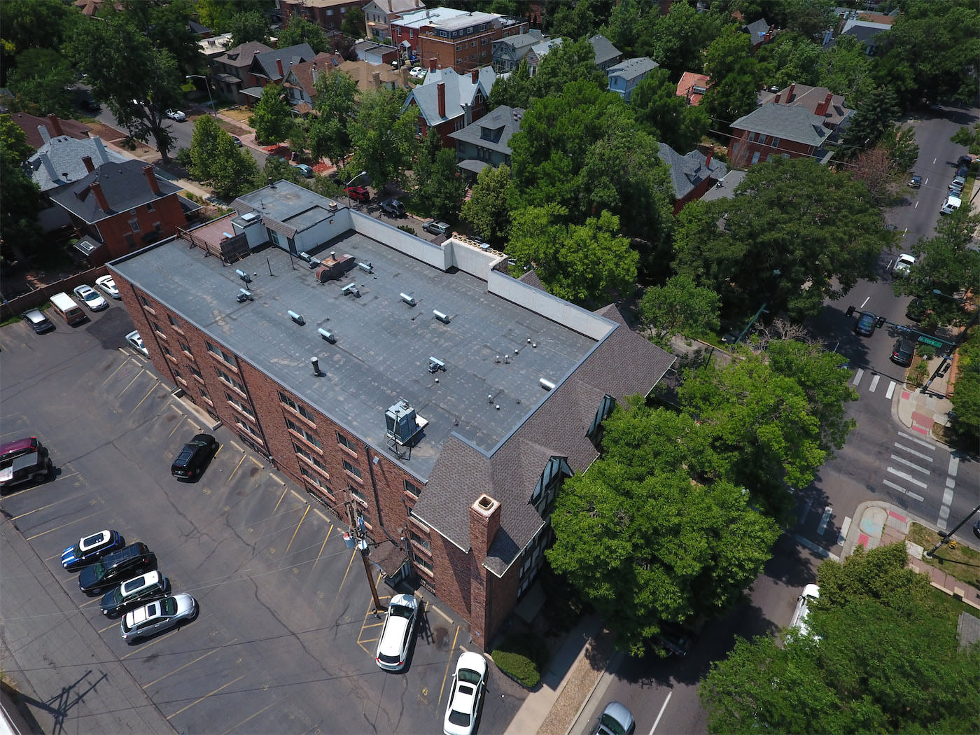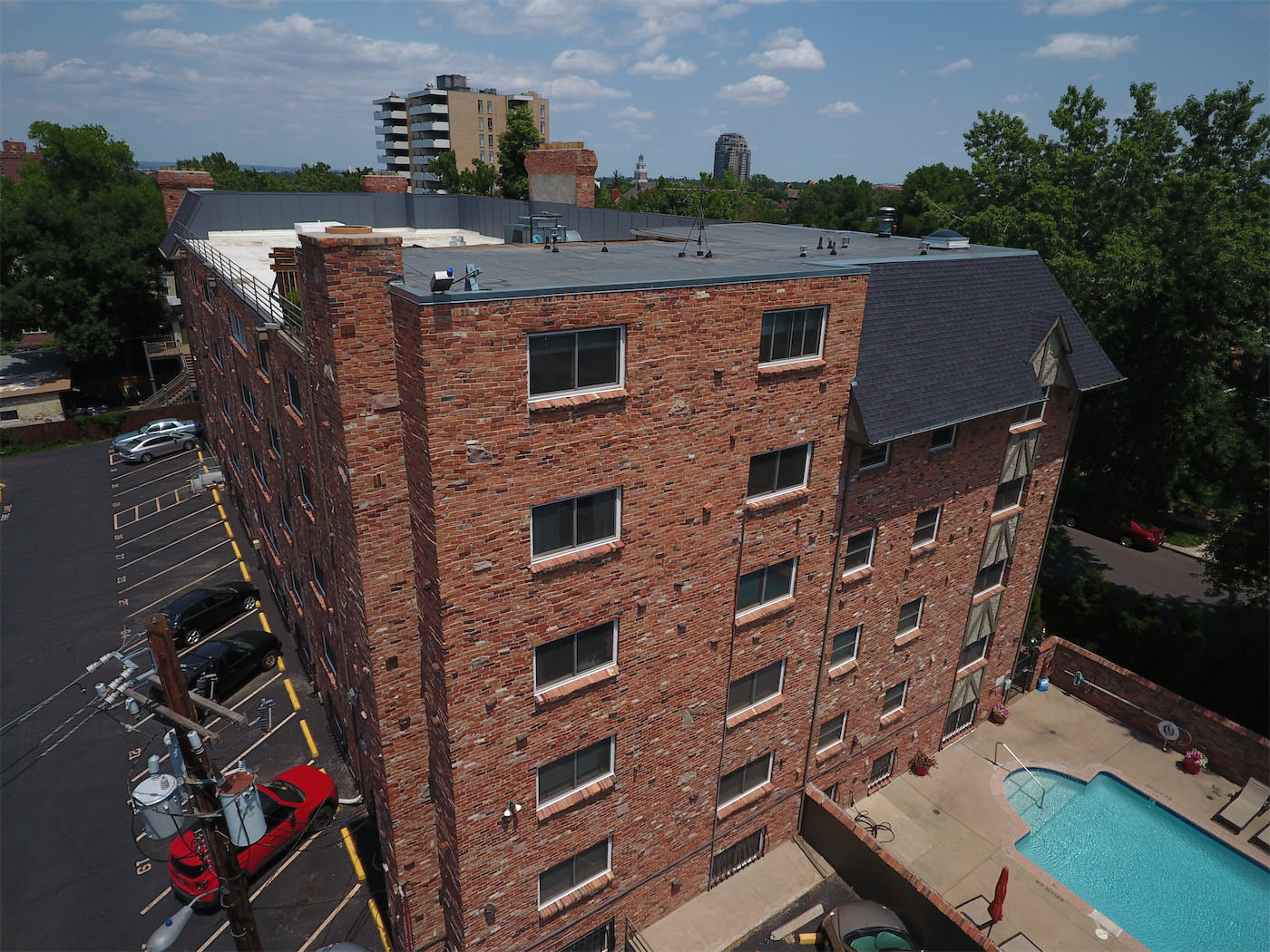 The Grant Park Association, having been referred to LR Contracting Inc. by another HOA, called and scheduled a complimentary 20--minute inspection. They knew there had been some HAIL, they did not know if they had suffered any real damage. Grant Park is a five-story, 56 unit, urban-green-condominium complex comprised of two buildings within enjoining courtyard and flat roof systems on the 4th and 5th floors. Grant Park is located on the edge of the Cherry Creek in Capitol Hill neighborhoods.